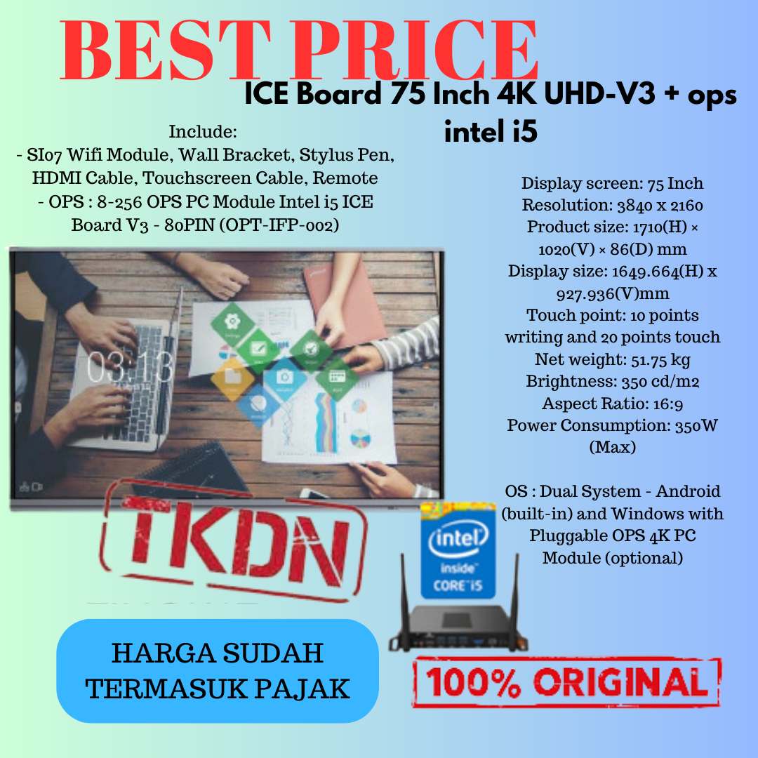 INTERACTIVE FLAT PANEL ICE BOARD 75 INCH 4K UHD-V3+OPS I5+stands